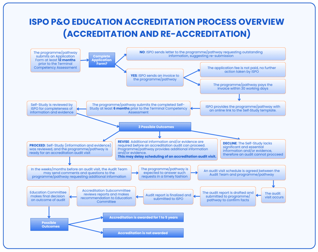 The ISPO Education Committee grants accreditation to programmes that meet the threshold expectations of quality that is specified in the standards. Objective decision making about programme accreditation depends on the information, data and statements made to the ISPO Education Committee in the context of just, efficient and standardized administrative processes of accreditation. Integrity is the central tenet of the accreditation process and ensures the administration, validation and protection of the rights of all parties.