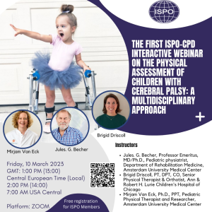 Register for the first ISPO Continuous Professional Development committee interactive webinar on “The Physical Assessment of Children with Cerebral Palsy: A Multidisciplinary Approach” on Friday March 10th, 2023 at 2.00pm CET including Q&A session. Please find here the programme.